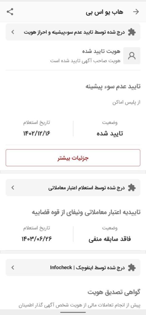 در سایر موارد، پس از ورود به صفحهٔ آگهی، در صورتی که کاربر افزونهٔ احراز یا استعلامی را برای آگهیاش فعال کرده باشد، میتوانید افزونه را در صفحهٔ آگهی مشاهده کنید.