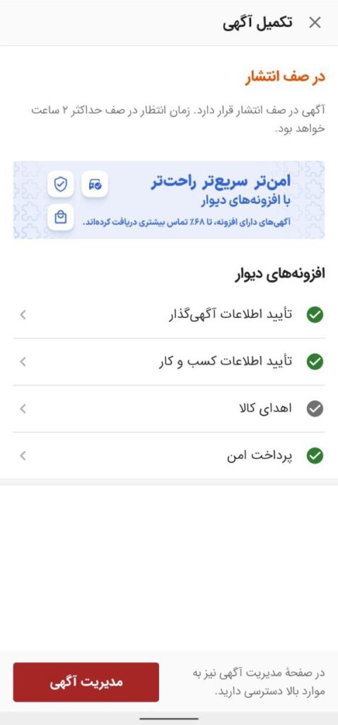 در صورت تکمیل موفق فرآیند، افزونهٔ مورد نظر شما به صورت زیر به آگهیتان اضافه میشود: