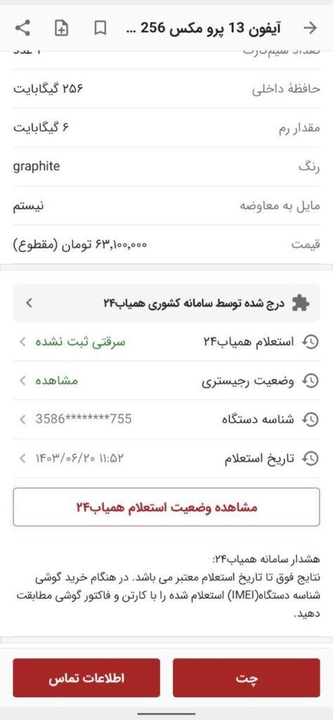 تاییدیه مشخصات گوشی تلفن همراه دریافت و در آگهی نمایش داده میشود.